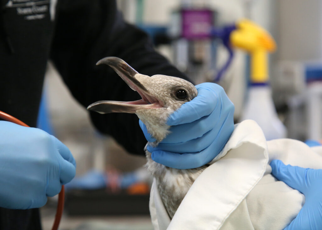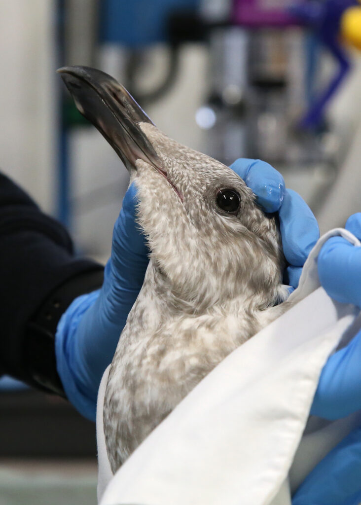 This juvenile glaucous-winged gull was found in the surf in Pacific City. They were dehydrated and not standing or using their legs at intake. On exam, staff discovered round lesions on the soles of their feet, and our veterinarian suspected they may have come in contact with a caustic substance. After a few days of fluid therapy and supportive care, the bird was standing again. The lesions resolved over the next weeks and the patient was moved to an outdoor aviary for flight conditioning. Once they were flying strongly again, the gull was ready to go!