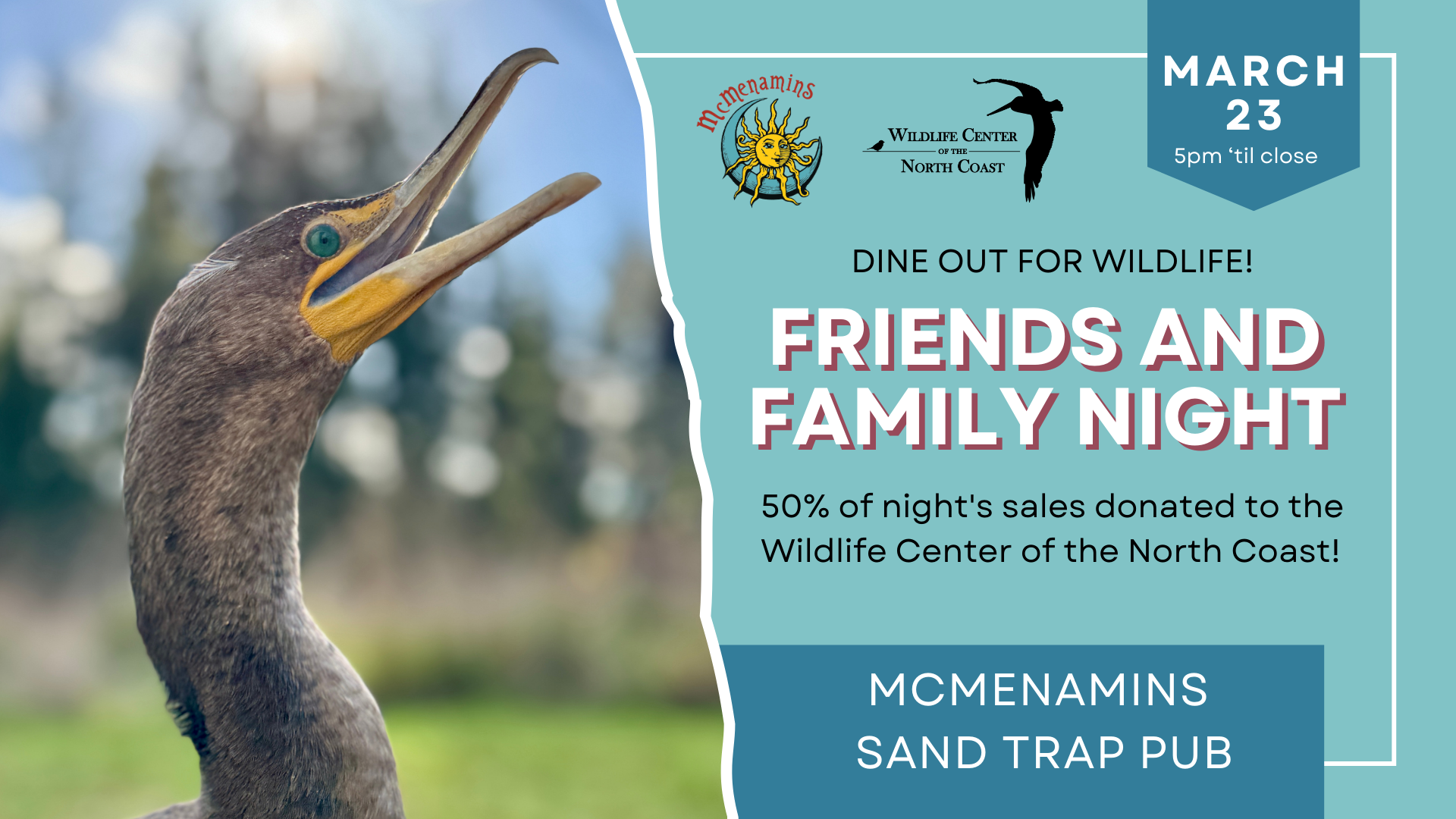 Dine out for wildlife! During McMenamins Friends & Family Night, 50% of sales from 5:00–10:00 PM support the Wildlife Center of the North Coast.